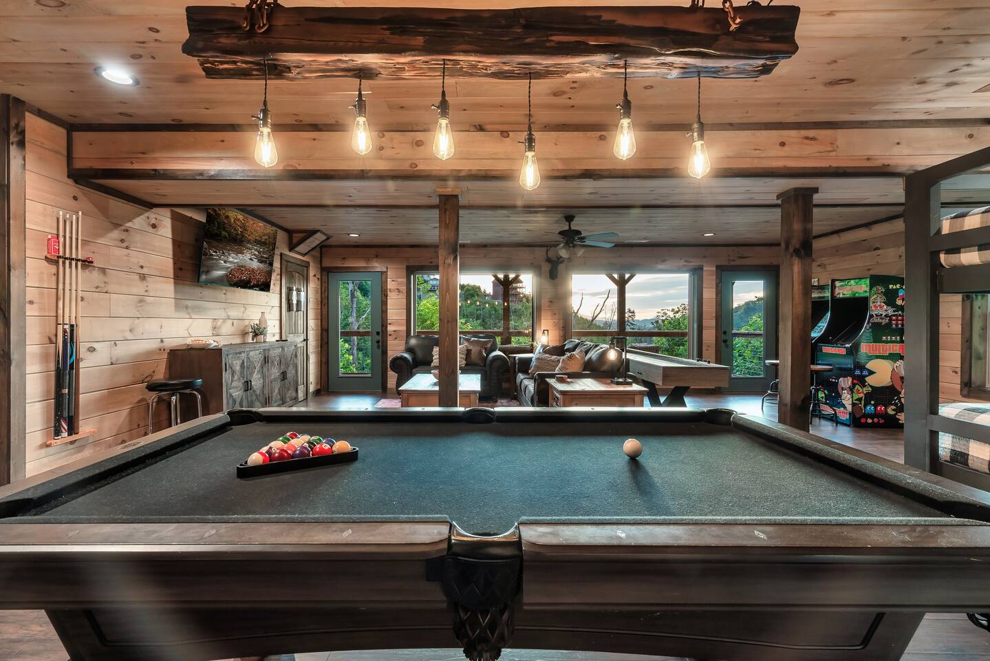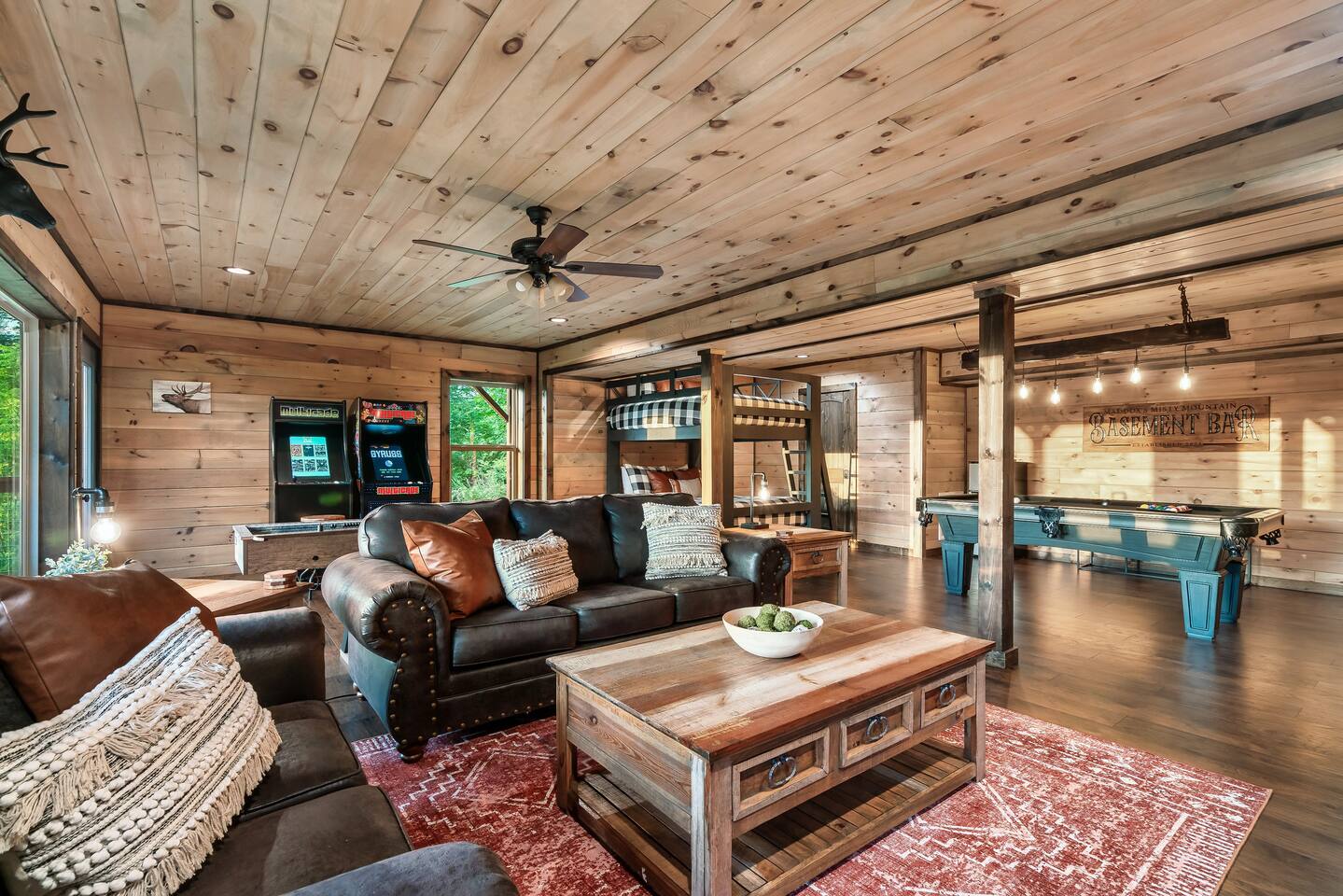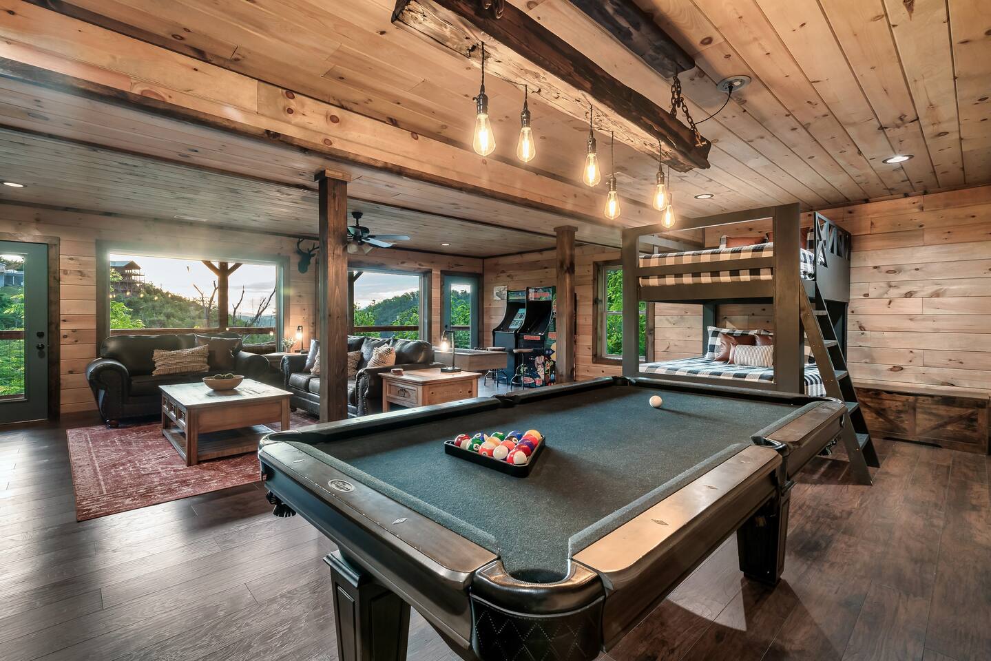 LUXURY meets LOCATION! Located in the coveted neighborhood of CHALET VILLAGE - you're minutes away from downtown Gatlinburg and have unique access to THREE POOLS, PICKLEBALL courts, and a FITNESS CTR! This 3-level spacious cabin is freshly renovated and PACKED with amenities including a pool table, hot tub, basement bar, shuffleboard, AND arcade games! Step outside on the multiple patios to take in the fresh mountain air and views. Keep your cameras ready for the frequent BEAR visitors!