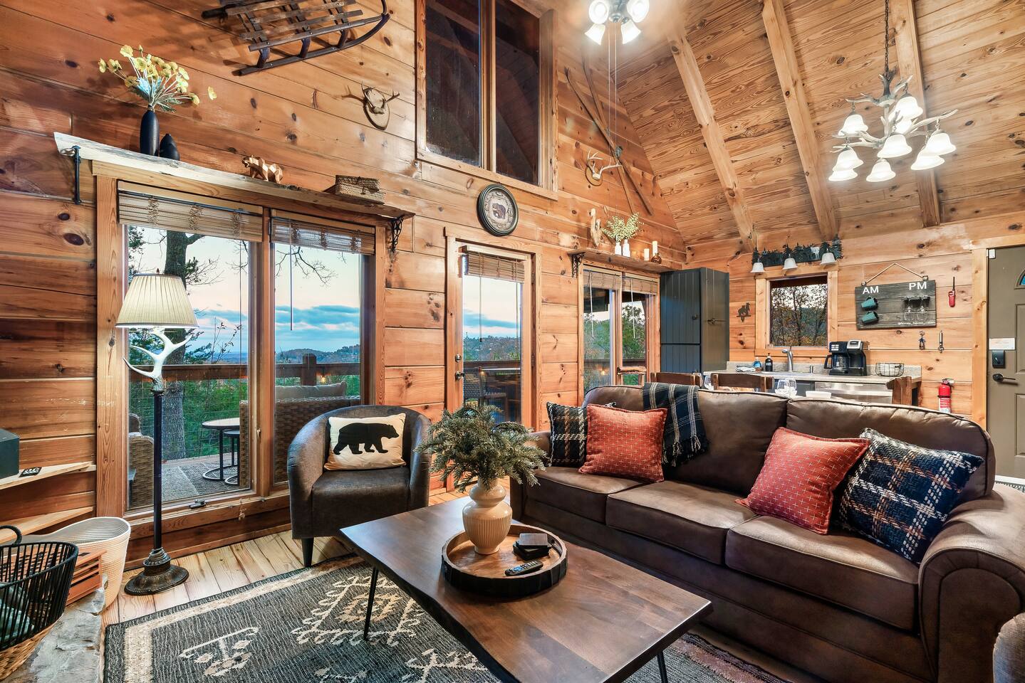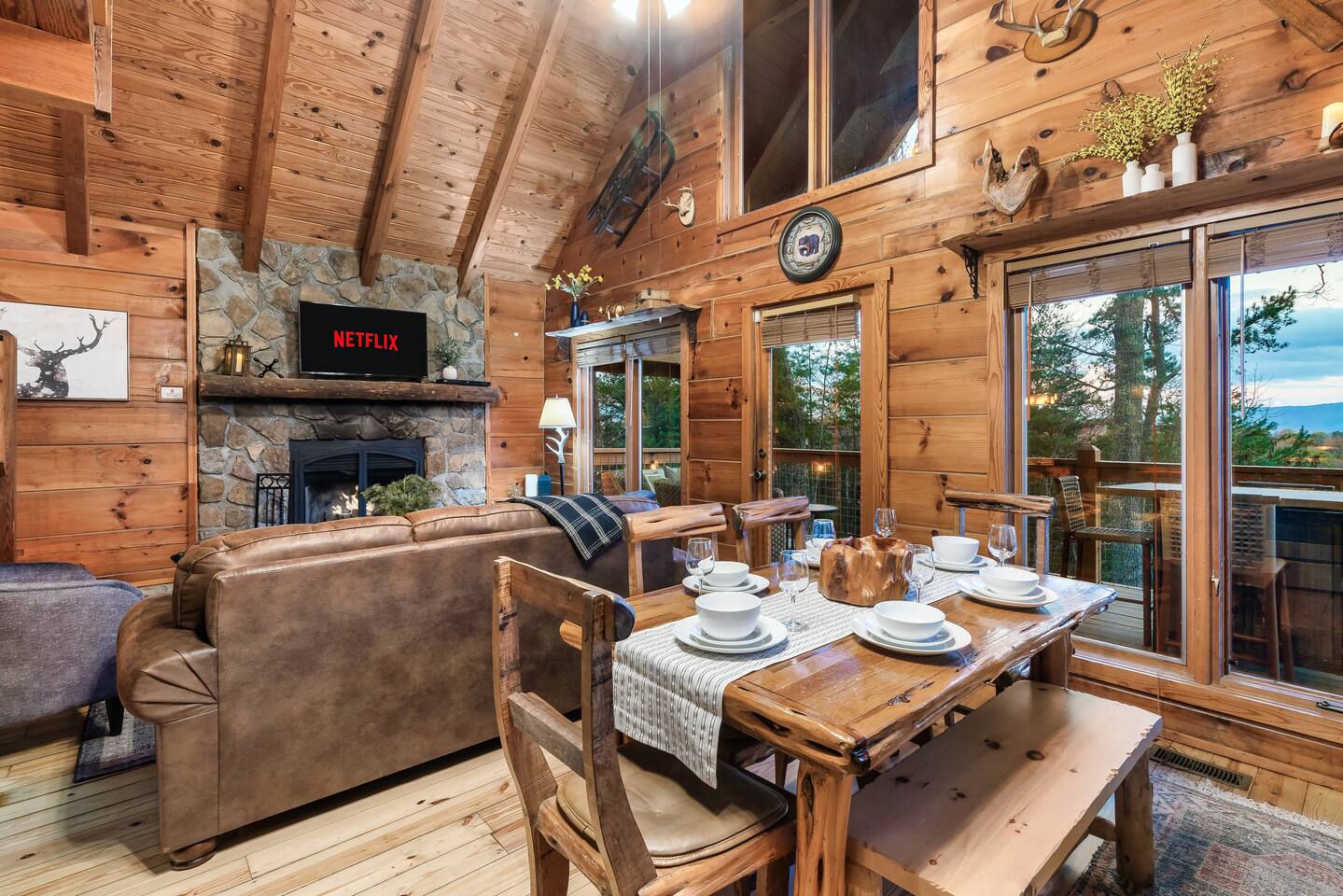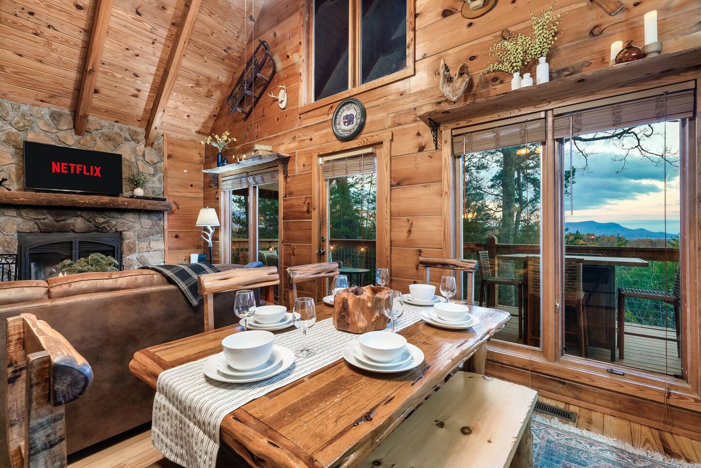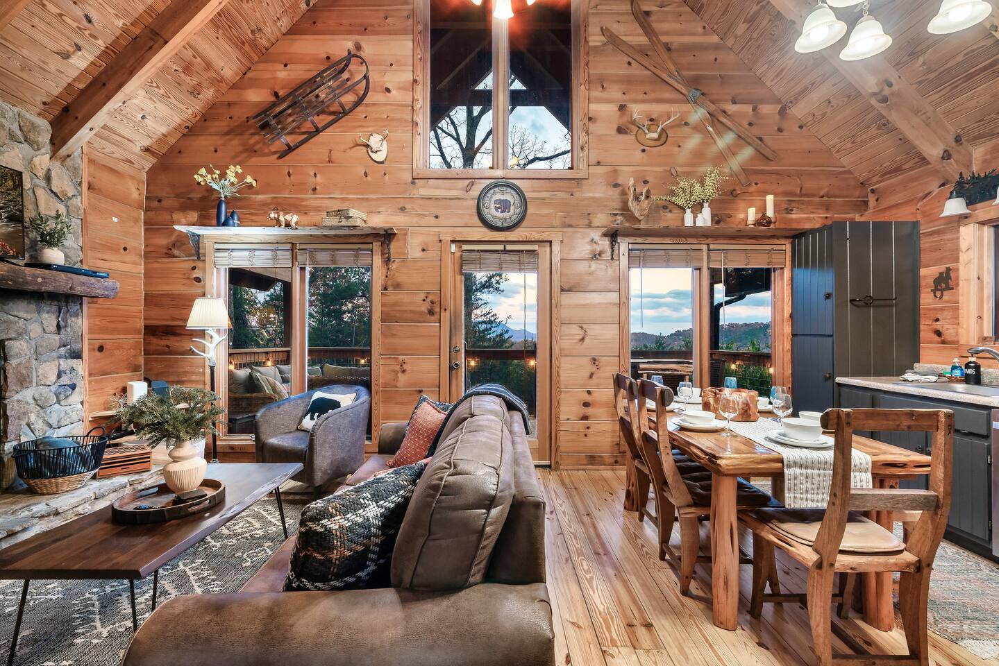 MOUNTAIN VIEW with CENTRAL LOCATION! It's NEAR IMPOSSIBLE to get these kind of views while being SO CLOSE to top attractions. Wake up w/ a cup of coffee on the porch overlooking Mt Leconte! At night soak up the views in the HOT TUB or kick back by the FIRE PIT! The interior is PROFESSIONALLY DESIGNED and the WOOD BURNING FIREPLACE gives you the Smoky Mtn vibe you've been looking for! Your stay comes with free access to a nearby resort featuring PICKLEBALL and a FISHING RIVER!